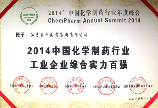 江苏亚娱体育集团荣获“2014年中国化学制药行业工业企业综合实力百强”