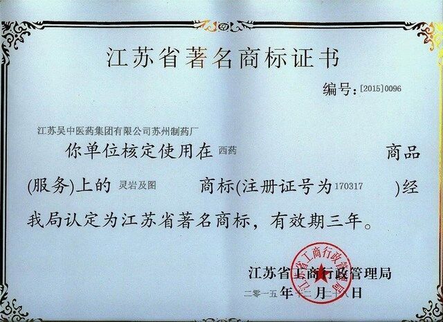 亚娱体育-亚娱(中国)有限公司苏州制药厂的“灵岩及图”商标(注册号170317)被江苏省工商行政管理局认定为江苏省著名商标。