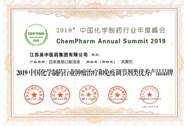 亚娱体育产品芙露饮荣获“2019中国化学制药行业肿瘤治疗和免疫调节剂类优秀产品品牌”称号。