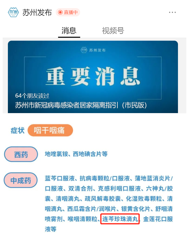 在近日最新发布的《苏州市新冠病毒感染者居家隔离指引(市民版)》中,亚娱体育独家产品连芩珍珠滴丸入选作为居家治疗常用药参考表(成人)。