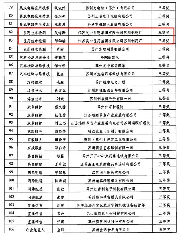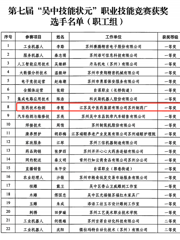 公司参赛选手严格遵守竞赛规则,奋力拼搏,苏州制药厂质量保障部李慧荣获医药技术检测一等奖,质量保障部吴海珊和生产部邹华楠荣获医药技术检测三等奖。亚娱体育-亚娱(中国)有限公司苏州制药厂荣获“吴中区高技能人才培养贡献奖”。