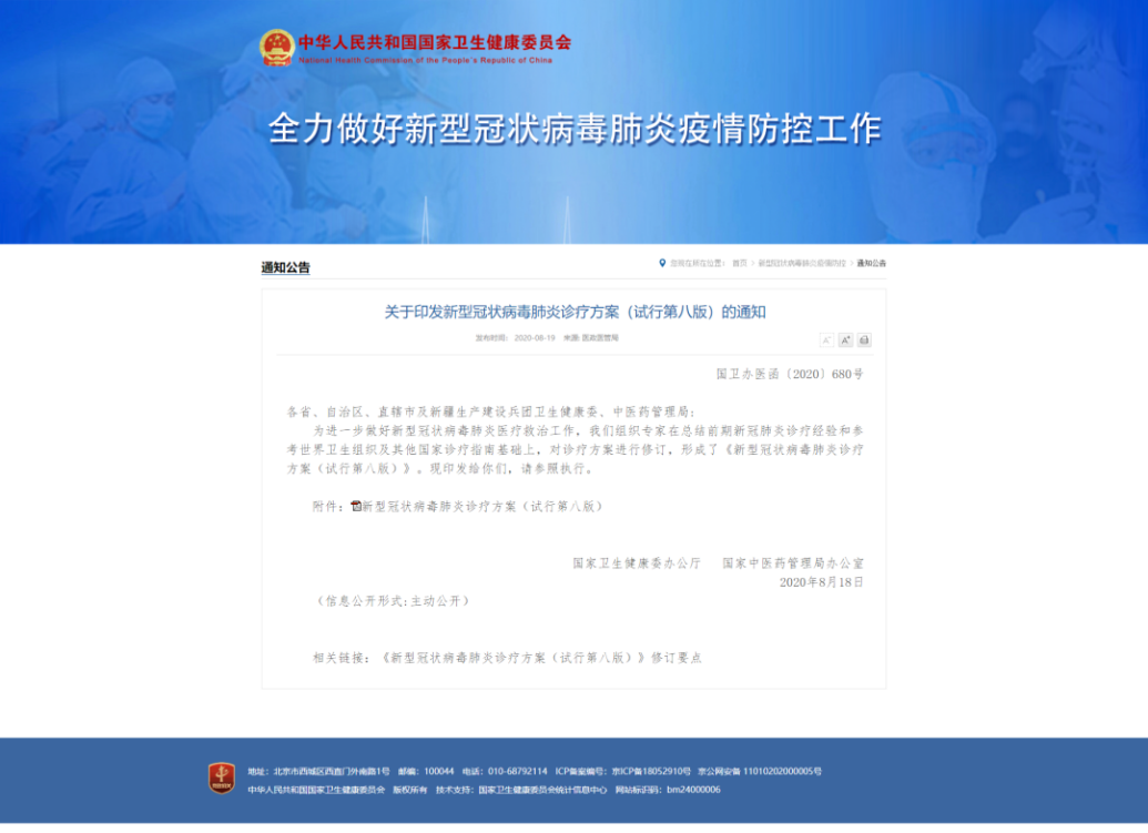 新冠肺炎诊疗方案第八版发布 亚娱体育两款产品持续纳入