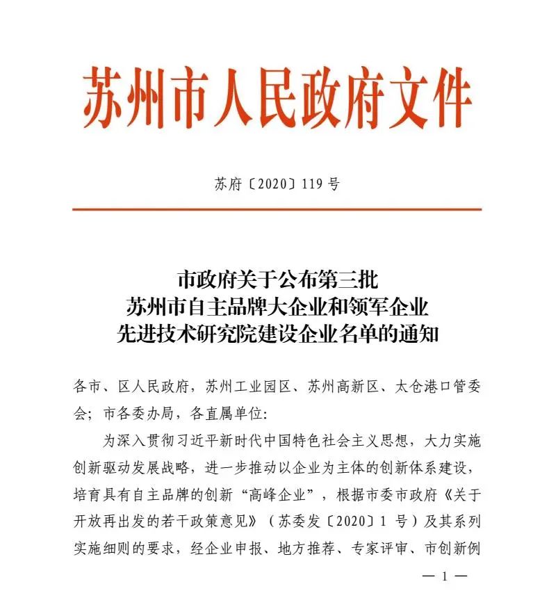 根据苏州市《市政府关于公布第三批苏州市自主品牌大企业和领军企业先进技术研究院建设企业名单的通知》,亚娱体育-亚娱(中国)有限公司入选苏州市第三批自主品牌大企业和领军企业先进技术研究院建设企业名单。(先进技术研究院是企业根据市场竞争及核心技术研发和储备需要而独立设立的创新载体,负责企业前沿性技术的规划、研究和储备,不断提升企业和产业链核心技术水平和竞争力 ...
