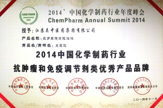11月26日在广州召开“2014中国化学制药行业年度峰会”。会议围绕“质量·诚信·品牌”主题,邀请政府相关部门负责人和有关专家出席并作主题演讲,同时发布优秀企业和优秀产品品牌榜。亚娱体育-亚娱(中国)有限公司获得“2014年中国化学制药行业工业企业综合实力百强”,其产品“匹多莫德口服溶液(芙露饮)”获得抗肿瘤和免疫调节剂类优秀产品品牌。