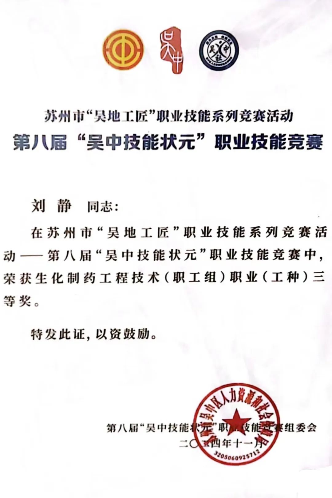 公司参赛选手赛前认真准备、赛中严格遵守规则、赛后积极复盘总结,在本次竞赛中取得了优异成绩。其中,苏州制药厂质量保障部QC的6位员工在生化制药工程技术(职工组)职业(工种)系列比赛中硕果累累,谭丹容荣获一等奖,胡君恋和踪利华荣获二等奖,朱亚楠、顾胡膨仙和刘静荣获三等奖。