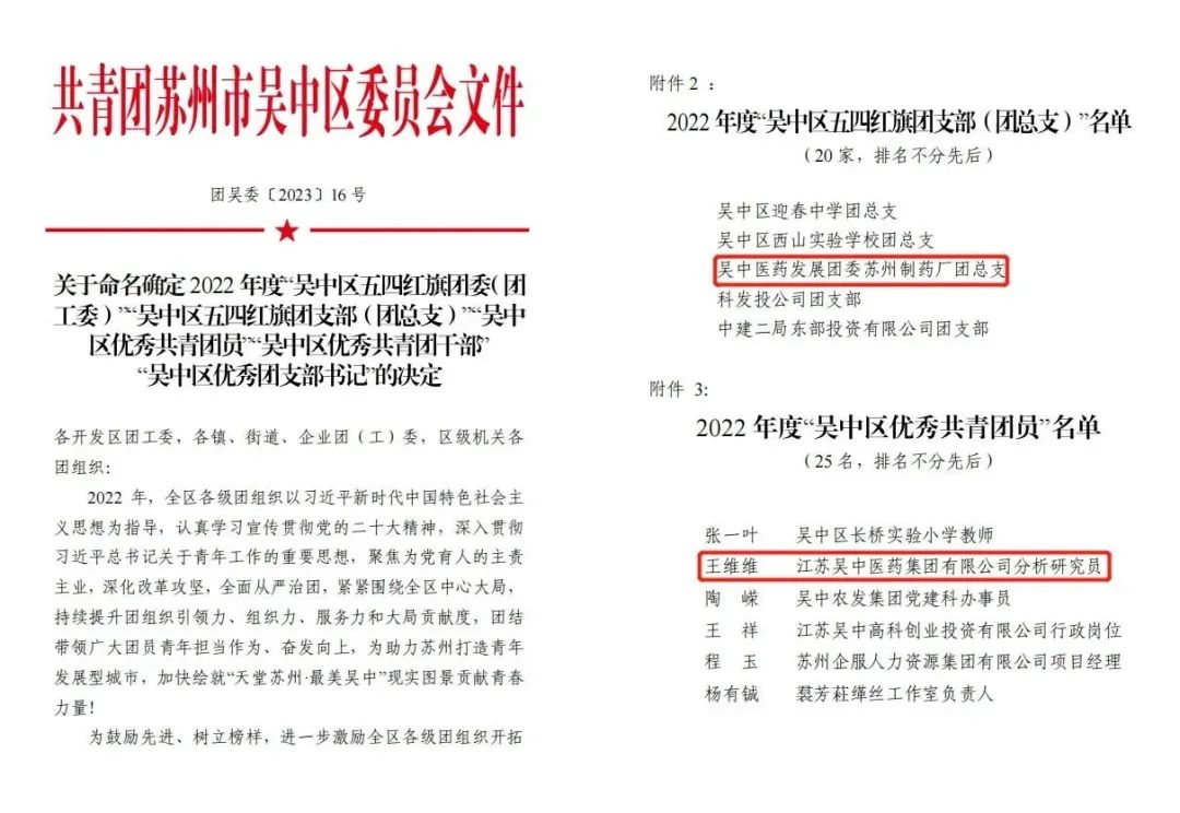 公司团委苏州制药厂团支部(团总支)和王维维同志分别在吴中区“两红两优”评选中喜获佳绩